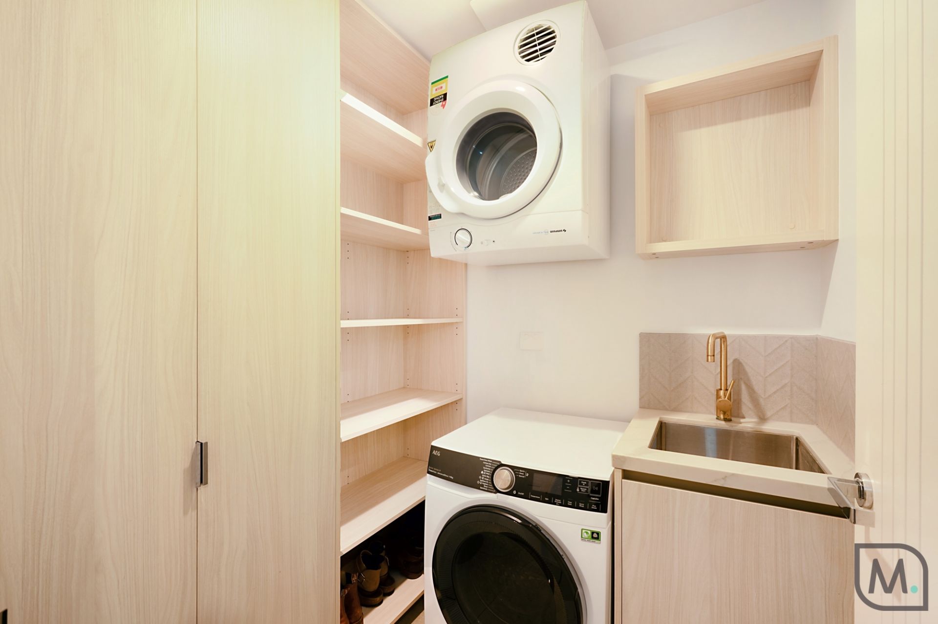 - Two fully tiled shower bathrooms with face-level storage, in-wall toilets